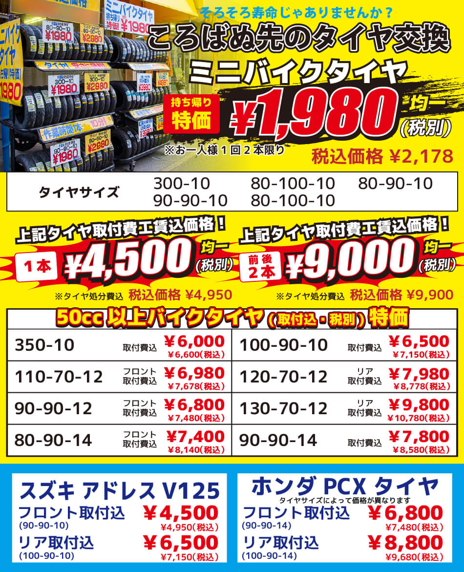 ミニバイクの持ち帰りタイヤ1,980円の商品はお一人様2本限定とさせていただきます。
